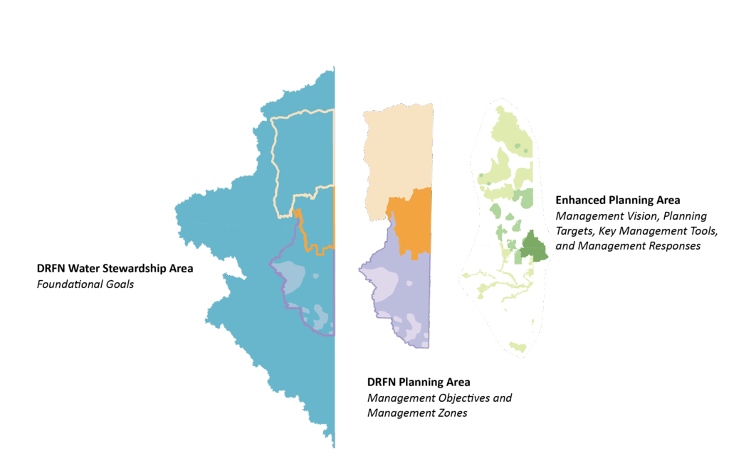 The DRFN Planning Area is the area within which DRFN is focusing its land use planning. It is within a larger Water Stewardship Area which includes key watersheds that are directly linked to the DRFN Planning Area. Activities in the Water Stewardship Area can have downstream impacts that become apparent within the DRFN Planning Area.